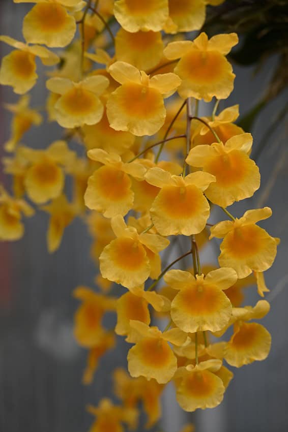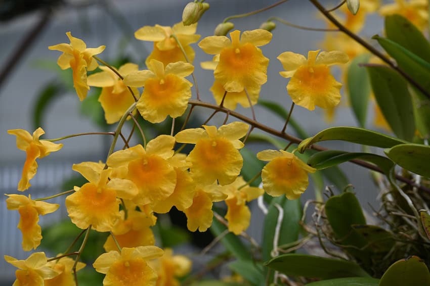 Dendrobium lindleyi yellow ( Dendrobium aggregatum) is found from India through Thailand, Laos, Vietnam and southern China. It’s cascading bright yellow flowers appear in the spring. To trigger blooming, the orchid must experience cool nights, 50 to 60 F, and dry conditions. Do not fertilize during this time either. Dendrobium lindleyi holds its leaves unlike some of its relatives.
