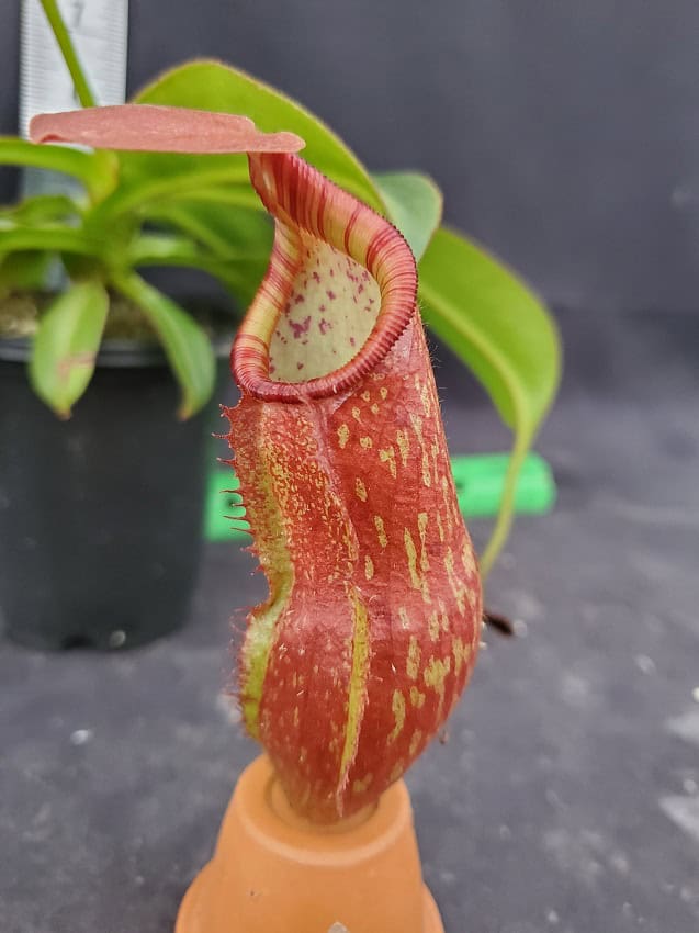 Endemic to the island of Mindanao, Philippines, this species has distinctive furry pitchers that are mostly orange or deep red.