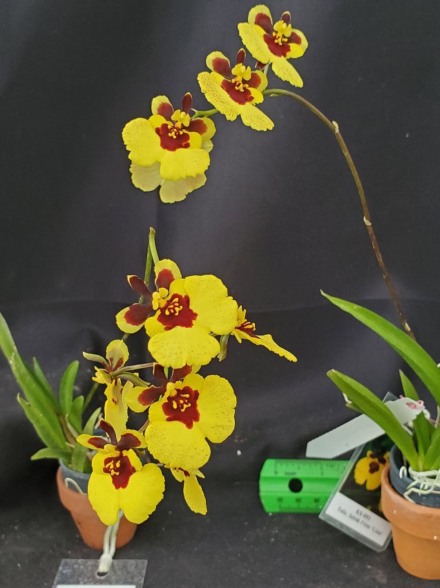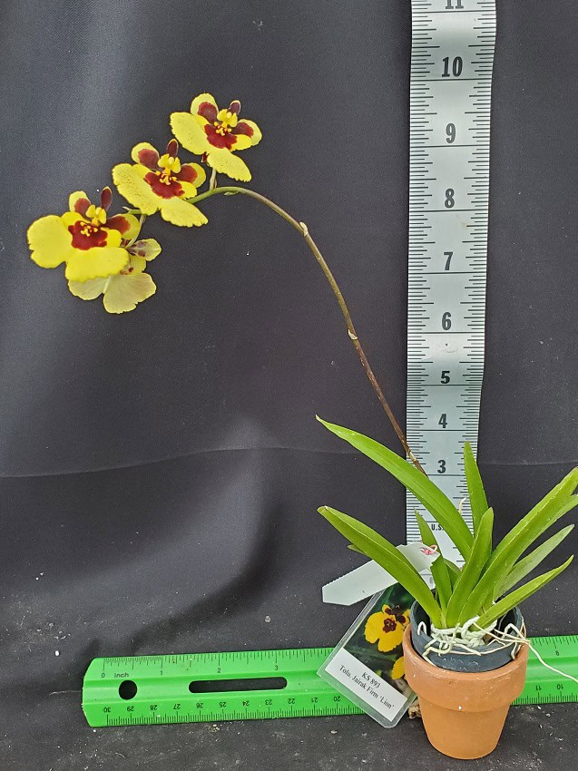 Tolumnia Jairak Firm ‘Lion’ are flowering size, which are currently growing in 1 inch plastic pots. These may be grown on the windowsill, under lights or in a greenhouse.